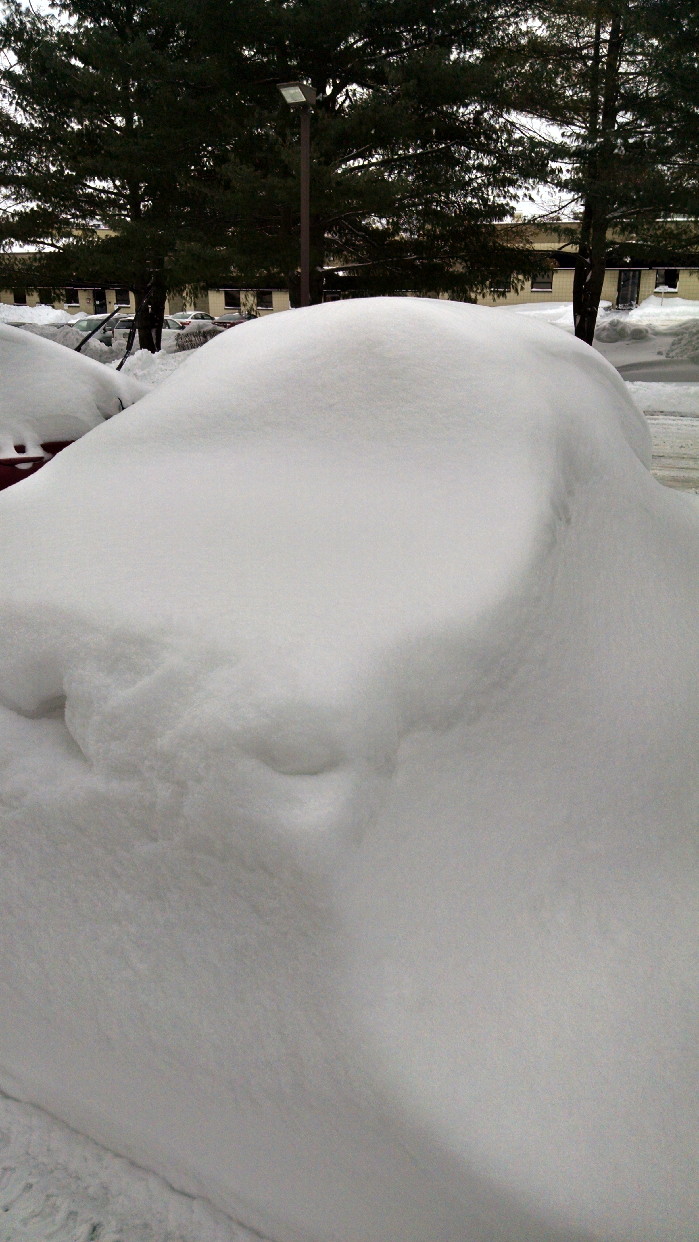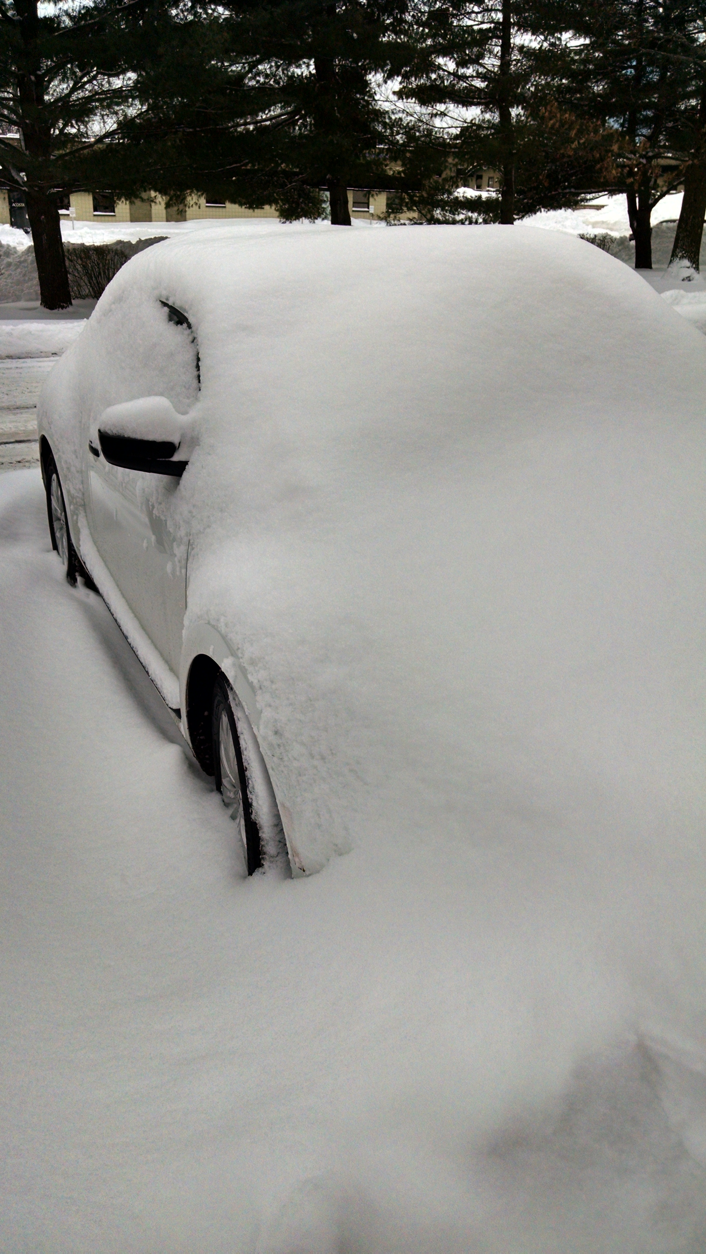 Did I mention parking? Snow brings out the worst. Disputes over parking spaces are the least of them. Just finding your car, when you have left it for any length of time, can cause unexpected problems. Can you spot the white VW bug in the attached photo? Not likely. Forget where you parked your car, and not even your panic alarm will save you, as it pulses silently, unseen, under a blanket of white powder.